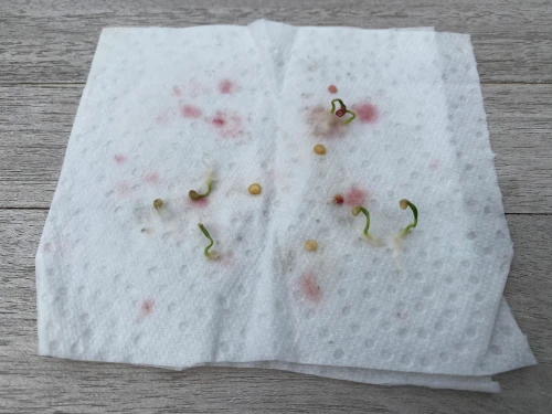 Controleer de zaadjes dagelijks op ontkieming en zorg ervoor dat het papier nog steeds vochtig is. Als deze uitdroogt, vernevel deze dan opnieuw.